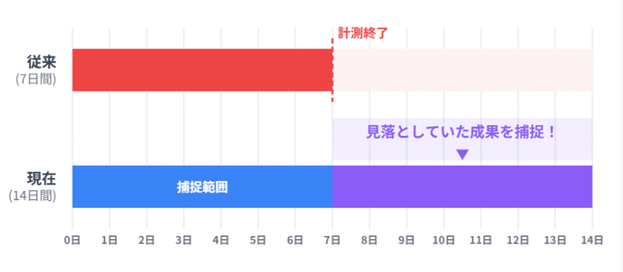 今回のアップデートにより、14日間アトリビューションなどが適用可能になり実際に購入を検討していた期間の成果を正しく計測できるように改善されました。