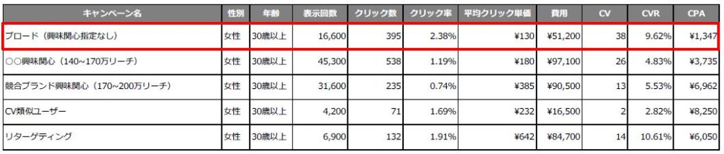 以前は「興味・関心」を指定して配信を行っていましたが、より効率的に成果の改善を行うため、興味関心や役職などの詳細ターゲットを指定せず、年齢・性別・地域のみを指定するブロード配信の実施をご提案しました。