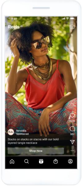Instagramリールとは、音楽やエフェクトを組み合わせた最大60秒の縦型動画を投稿できる、モバイル専用の配信面です。より没入感のある効果的なフォーマットで、商品に関心の高いオーディエンスにリーチできます。これはオーガニックリールコンテンツの間に表示され、ユーザーは広告にコメントや「いいね!」の追加、閲覧、保存、シェア、スキップすることが可能です。