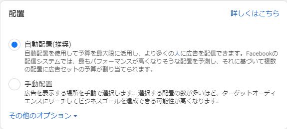 自動配置を選択したい場合は、新規入稿、もしくは入稿後の編集の際に広告セットの階層で設定を行います。