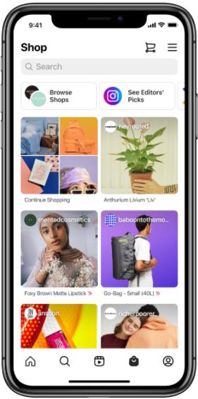 Instagramショップとは、Instagramの「ショッピングバッグアイコン」をタップすることで表示される配信面で、いわゆるオンライン版のウィンドウショッピングができるような機能を搭載しています。この配信面においては、商品がタグ付けされた投稿などと並んで広告が表示され、ユーザーが広告をタップすることで商品の詳細ページへと遷移します。