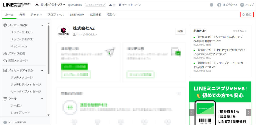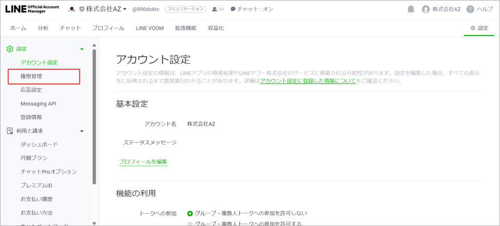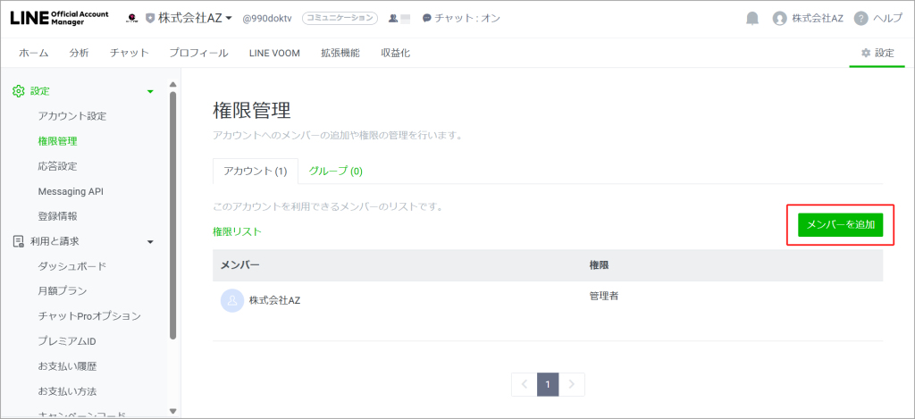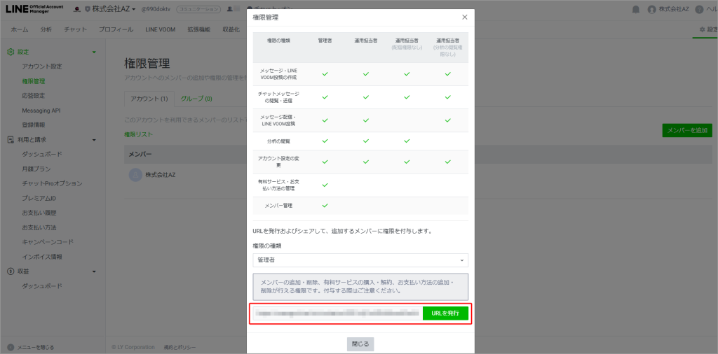 | メッセージ・LINE VOOM投稿の作成 | チャットメッセージの閲覧・送信 | メッセージ配信・LINE VOOM投稿 | 分析の閲覧 | アカウント設定の変更 | 有料サービス・お支払い方法の管理 | メンバー管理 | |