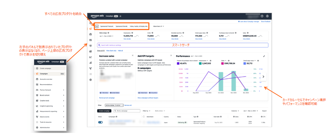 これにより、すべての広告プロダクト(Sponsored Products、Sponsored Brands、ビデオ、オーディオ、ディスプレイ広告)を同一の管理画面で管理ができ、新規キャンペーンの作成も一元化されました。