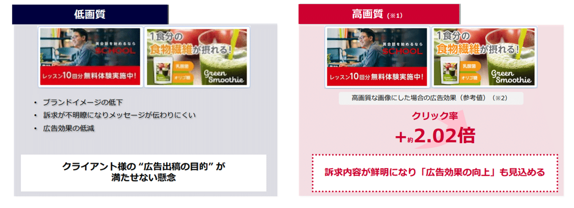 高画質の画像を利用することで訴求内容が鮮明になり、効果の向上が見込めます。